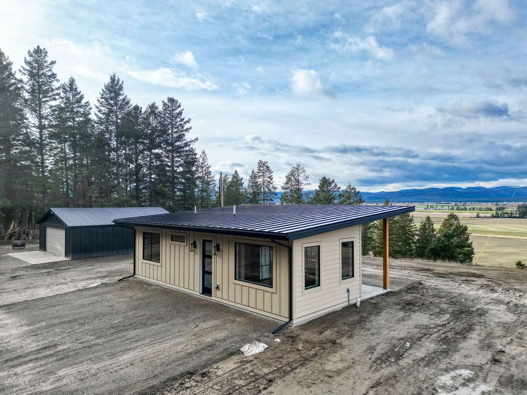 Epic Flathead Valley views from the top of a private bluff! This brand-new mountain modern home sits on 5 private acres just off KM Ranch Road at 1310 Prairie View Rd, Kalispell, offering panoramic views to Big Mountain in Whitefish and unforgettable Montana sunsets and starry skies. The new construction 2 bedroom, 2 bath home is ideal for full-time living, a Montana getaway, or short-term rental investment. Enjoy air conditioning, all new appliances, modern finishes, and seamless indoor-outdoor living designed to capture the views. A detached two-car garage adds convenience and storage. Future potential is already in place with a second, prepped building site, septic approved for six bedrooms, and drainfield installed for the larger home. 484.5 acres of adjacent state land provide added privacy, recreation, and open space. Private, peaceful, and move-in ready"”this is premier Kalispell view living.