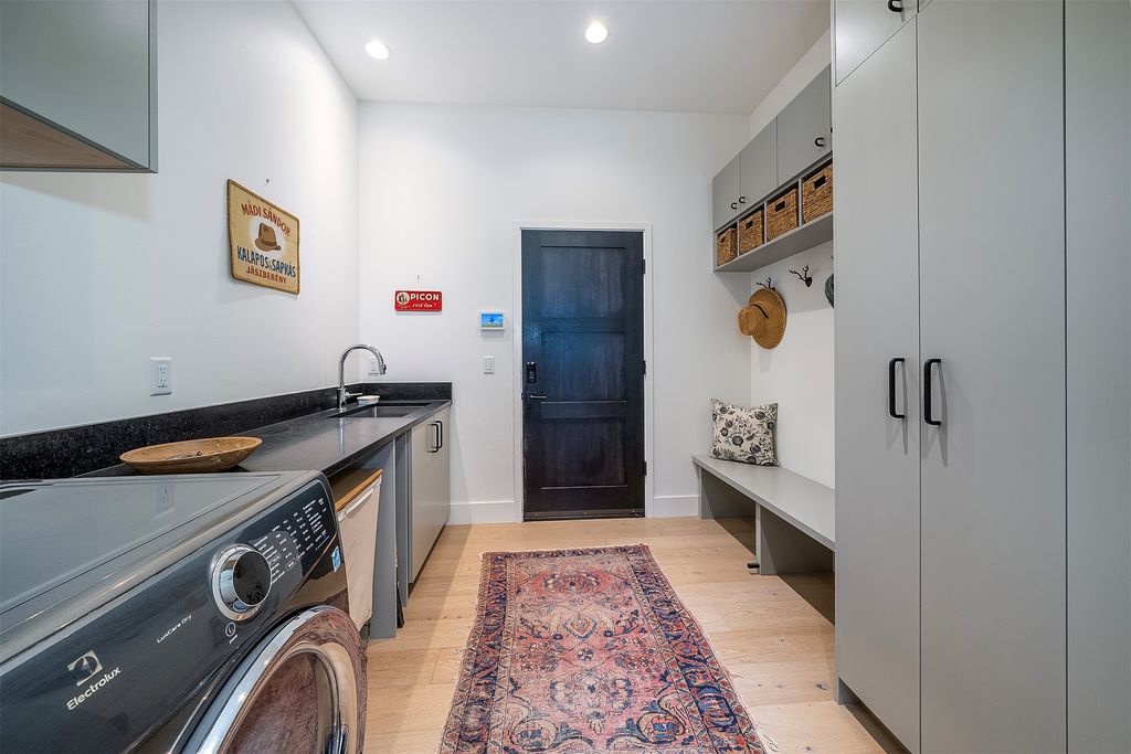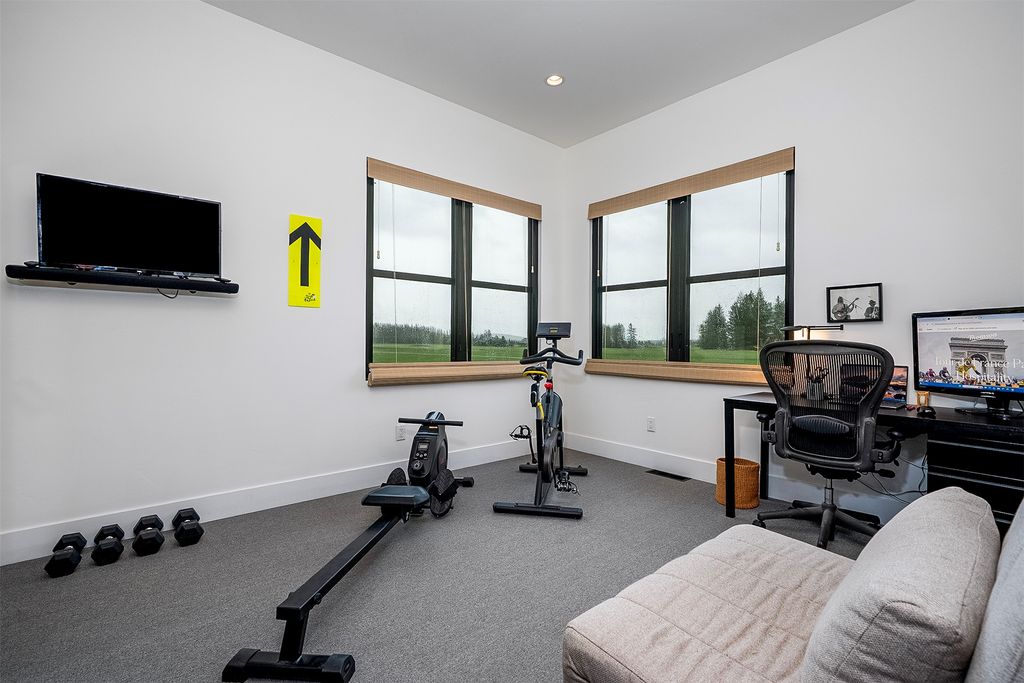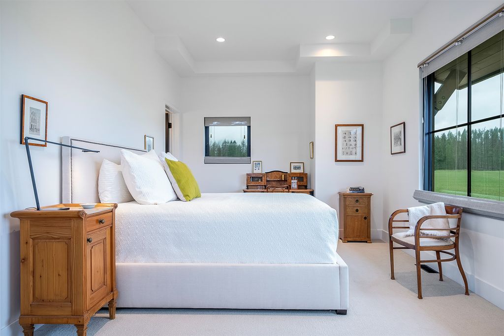 Welcome to this stunning Montana Modern residence on 20 pristine acres bordering Forest Service land, and sited to maximize sweeping views of heritage ranch land and the mountains beyond. Designed by renowned architects Cushing Terrell and built in 2021 by Malmquist Construction, this 5-bedroom, 5.5-bathroom home offers 4,153 square feet of refined living space. The innovative design consists of two tall "barn" structures which anchor the heart of the home - a sleek yet cozy Great Room housing the living and dining rooms, kitchen, and lounging nook. Expansive windows frame the views, and the wrap-around deck invites indoor/outdoor living, while creating privacy and outdoor living spaces that follow the sun. The main floor spans 3,250 square feet and includes four spacious bedrooms, three full bathrooms, a powder room, 2 person sauna, and mud/laundry room. Upstairs is the luxurious primary suite, featuring a sleeping area with spectacular mountain views, a cozy sitting area with fireplace, and dual full bathrooms -- creating a private retreat with elevated comfort. A heated 4-car garage has a separate stall for use as a tractor bay and/or workshop, as well as a ski/bike locker room. A state-of-the-art geothermal system keeps the home cool in the summer and warm in the winter. The landscape plan by legendary Montana landscape architect Bruce Boody/NWDS wraps the home with exterior intention, from the breathtaking fire pit views to the vegetable garden adjacent to the kitchen for last minute herb-cutting while cooking. This property offers a rare opportunity to own a home that combines impeccable design surrounded by legacy land with an exclusive location and views, just 12 minutes from downtown Whitefish.