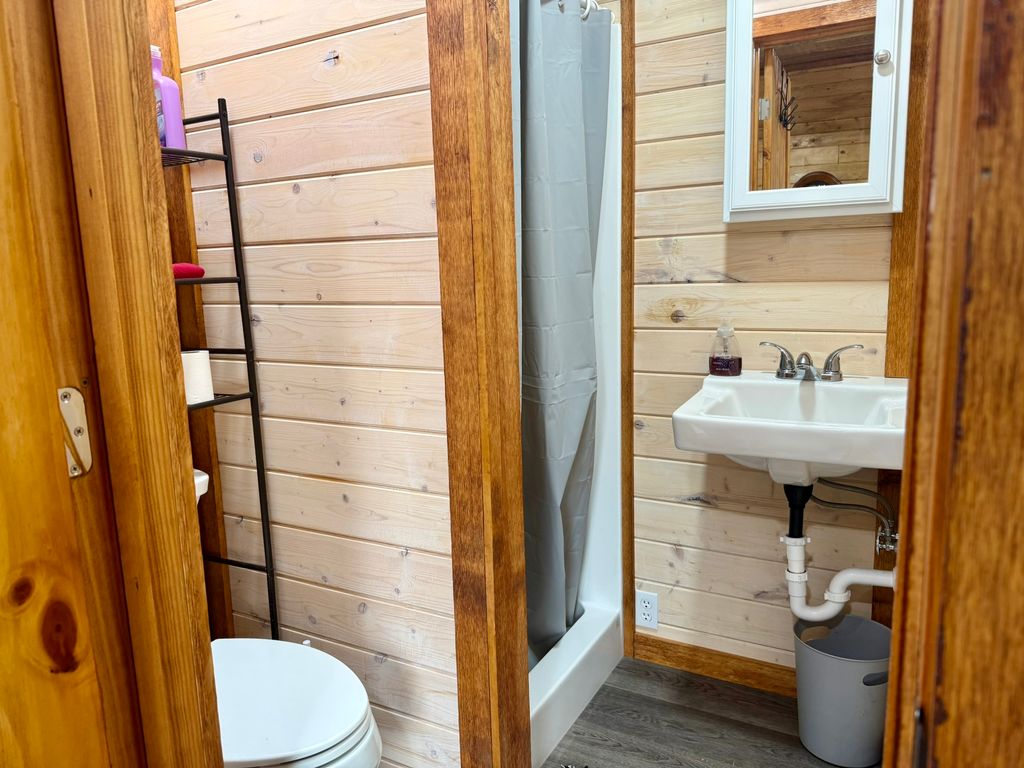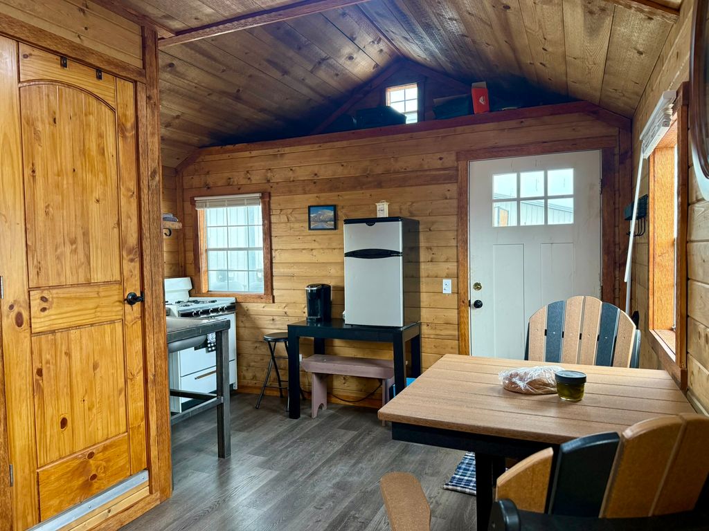 Built in 2022, this well-constructed home features spray foam insulation throughout (floor, walls, and ceiling) and warm wood finishes. Efficient floorplan includes a custom steel kitchen counter, vented propane wall heater, on-demand hot water and loft storage. Large multi-purpose room with double-door access offers excellent storage or additional living space. Home is on skids and ready to be moved. Relocation at buyer's expense; seller can assist with moving contacts and coordination. Great value for a turn-key home! No land included. Overall exterior dimensions are 14 x 44. The storage room is insulated but not finished and measures approx. 14 x 10. There is a 4' covered front porch.
