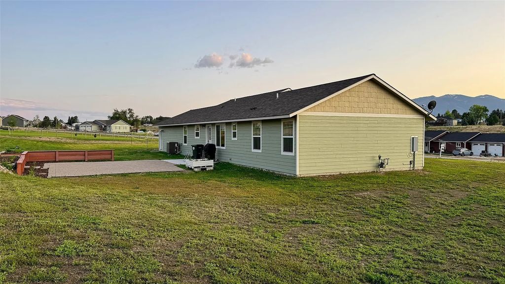 Set on 1.37 acres in a desirable Corvallis neighborhood, this 2019 built home offers a seamless blend of space, comfort, and modern design. Featuring 4 bedrooms and a thoughtfully designed single-level layout, the open-concept living area is filled with natural light and anchored by a beautifully appointed kitchen with white cabinetry, stainless steel appliances, and island seating. The outdoor space is a true highlight of the property. The expansive yard offers endless potential"”whether you envision creating a landscaped oasis, adding a shop, or simply enjoying the open space and privacy. A concrete patio provides the perfect setting for outdoor dining or relaxing while taking in the surrounding scenery. Positioned to capture sweeping views of the Bitterroot Mountains, the property delivers a setting that feels both peaceful and connected to the landscape. Equipped with a heat pump system, central air, and a private well with strong production, this home offers both efficiency and everyday comfort. Surrounded by quality homes, this is a rare opportunity to own a newer home on acreage in a highly sought-after location.